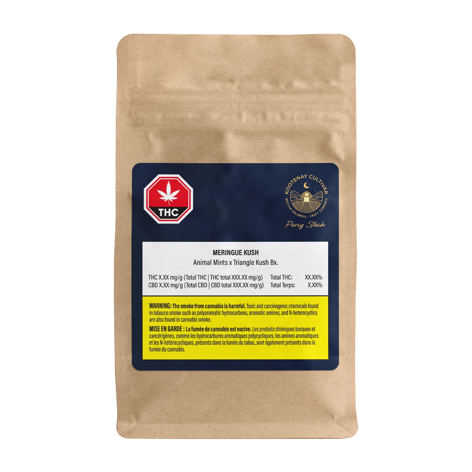 The Meringue Kush genetic was bred and grown by Kootenay Cultivar using living soil organics at their facility in Salmo BC. This potent indica-hybrid is rich in terpenes and characterized by notes of candy and gas. The plant's colourful, frosty buds are cured for 4 weeks before packaging at Woody Nelson in Nelson BC.